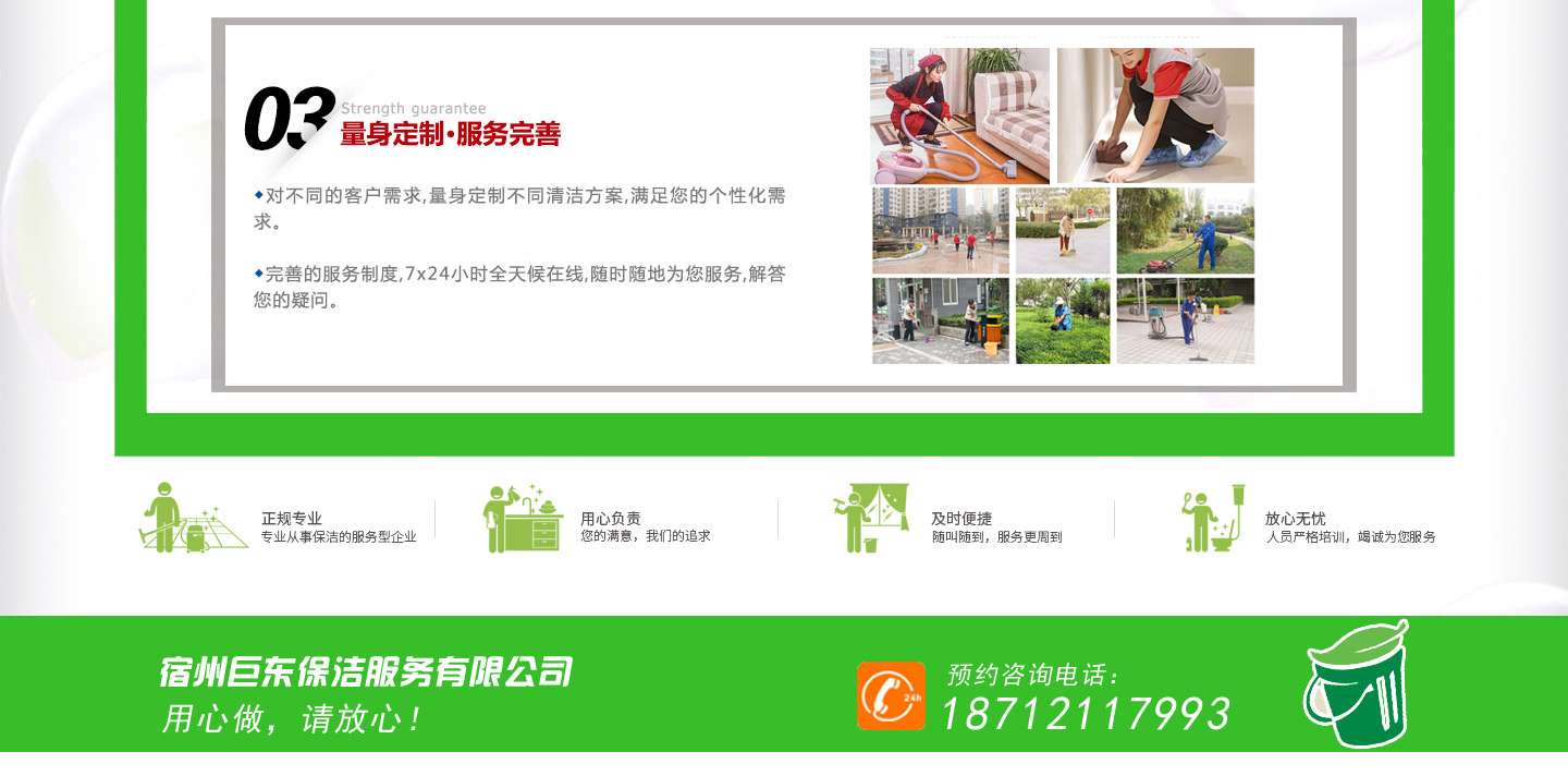 宿州市巨東保潔服務(wù)有限公司是一家專(zhuān)門(mén)為公寓、公司、賓館、單位、商場(chǎng)、工礦企業(yè)、學(xué)校等大型公共場(chǎng)所提供長(zhǎng)期、全面的保潔、保養(yǎng)、維護(hù)、消滅殺等服務(wù)的專(zhuān)業(yè)團(tuán)隊(duì),并且我們與各大保潔公司都有合作關(guān)系,更好的為客戶(hù)服務(wù)。 應(yīng)眾多蚌埠客戶(hù)的要求,巨東保潔公司目前已在蚌埠成立分公司,我們勵(lì)志為更多的蚌埠企業(yè)單位貢獻(xiàn)自己的力量,蚌埠分公司地址是蚌埠市光彩城九區(qū)11棟7號(hào),歡迎各界朋友蒞臨參觀(guān)。...